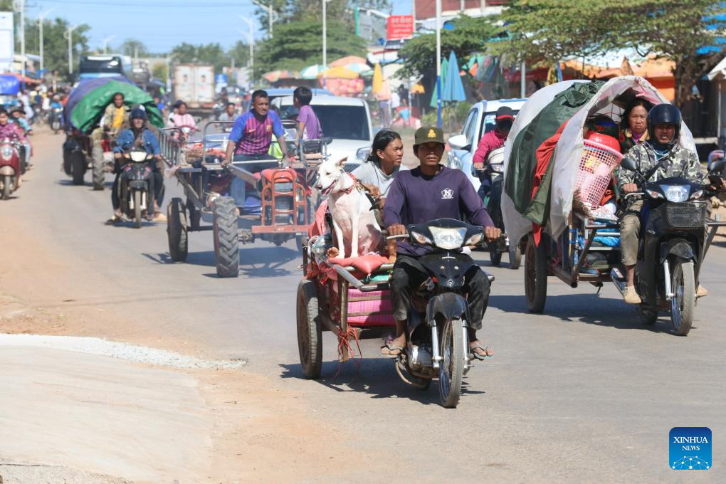 Civilians flee Srei Snam district in Cambodia's Siem Reap province on Dec. 15, 2025. Thai military forces' attack on Cambodia in the 4th Military Region has entered further deep into Cambodian sovereign territory, said the Cambodian Ministry of Defense on Monday. The Thai military forces have expanded their airstrikes to a location in northwest Cambodia's Siem Reap province, the ministry said in a press release, adding that the Thai military used an F-16 fighter jet to drop two bombs near a displaced civilian camp in the province at 10:00 a.m. on Monday local time. The fresh border conflict with Thailand has left 12 Cambodian civilians dead and 74 others injured as of 6 p.m. local time on Sunday, Cambodia's Interior Ministry Spokesperson Touch Sokhak said at a press briefing on Monday. (Agence Kampuchea Presse via Xinhua)