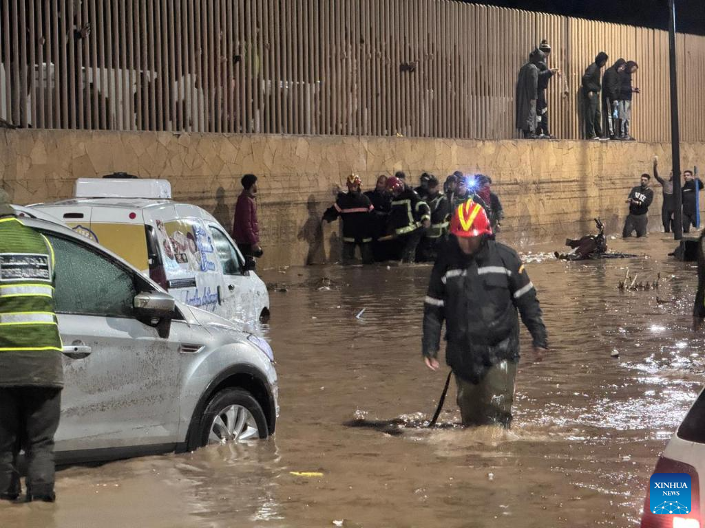 Rescuers from the local security and civil defense department work in a flood-hit area in Safi province, Morocco, Dec. 14, 2025. At least 41 people were killed in flash floods caused by heavy rainfall in Morocco on Sunday, authorities said on Monday. In the Atlantic coastal province of Safi, local authorities said in a statement that the death toll had risen to 37, with 14 injured people receiving treatment at local hospitals. In the southern province of Tinghir, four people were killed after their vehicle was swept away by strong currents and overturned into a river between the areas of Fezou and El Hafira, local news outlet Hibapress reported. (Photo by Saouri Aissa/Xinhua)