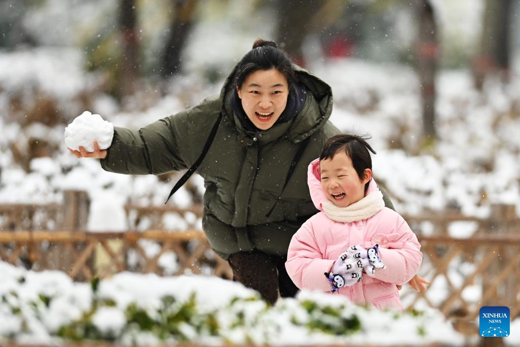 A mother and her child play with snow at Jinghe Park in Tengzhou City, east China's Shandong Province, Dec. 13, 2025. (Photo by Li Zhijun/Xinhua)