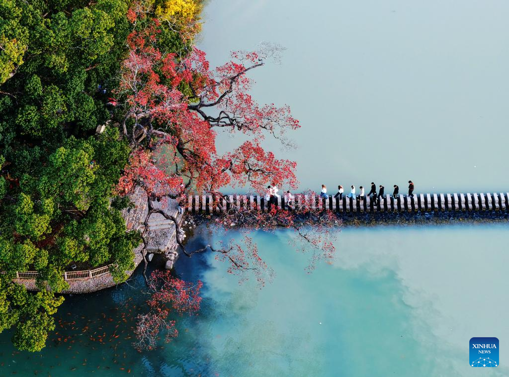 An aerial drone photo taken on Nov. 23, 2025 shows tourists enjoying sightseeing on an arch bridge near Wenchang pavilion in Ningbo City, east China's Zhejiang Province. (Photo by Hu Xuejun/Xinhua)