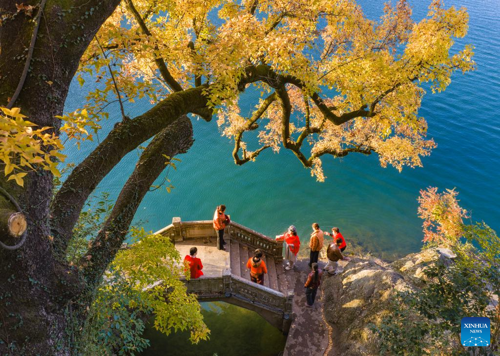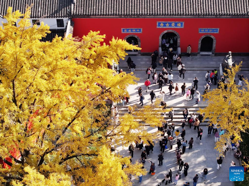 A drone photo taken on Nov. 29, 2025 shows tourists enjoying sightseeing under a ginkgo tree at Qixia mountain scenic spot in Nanjing City, east China's Jiangsu Province. (Photo by Liu Jianhua/Xinhua)