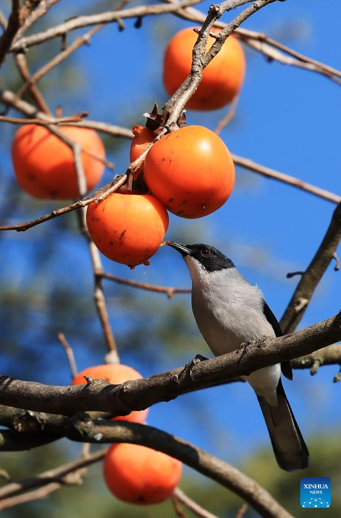 A bird eats persimmon on a branch in Qujing City, southwest China's Yunnan Province, Dec. 11, 2025. (Photo by Sun Wenlai/Xinhua)
