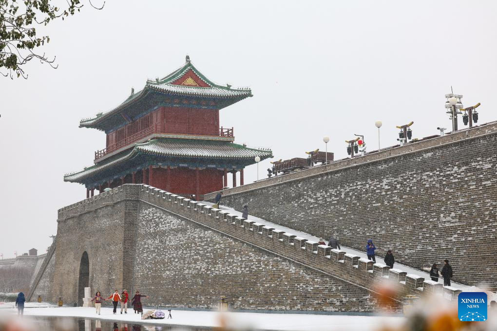 Tourists visit the south gate of the Zhengding ancient city in snowfall in Shijiazhuang City, north China's Hebei Province, Dec. 12, 2025. (Photo by Liang Zidong/Xinhua)