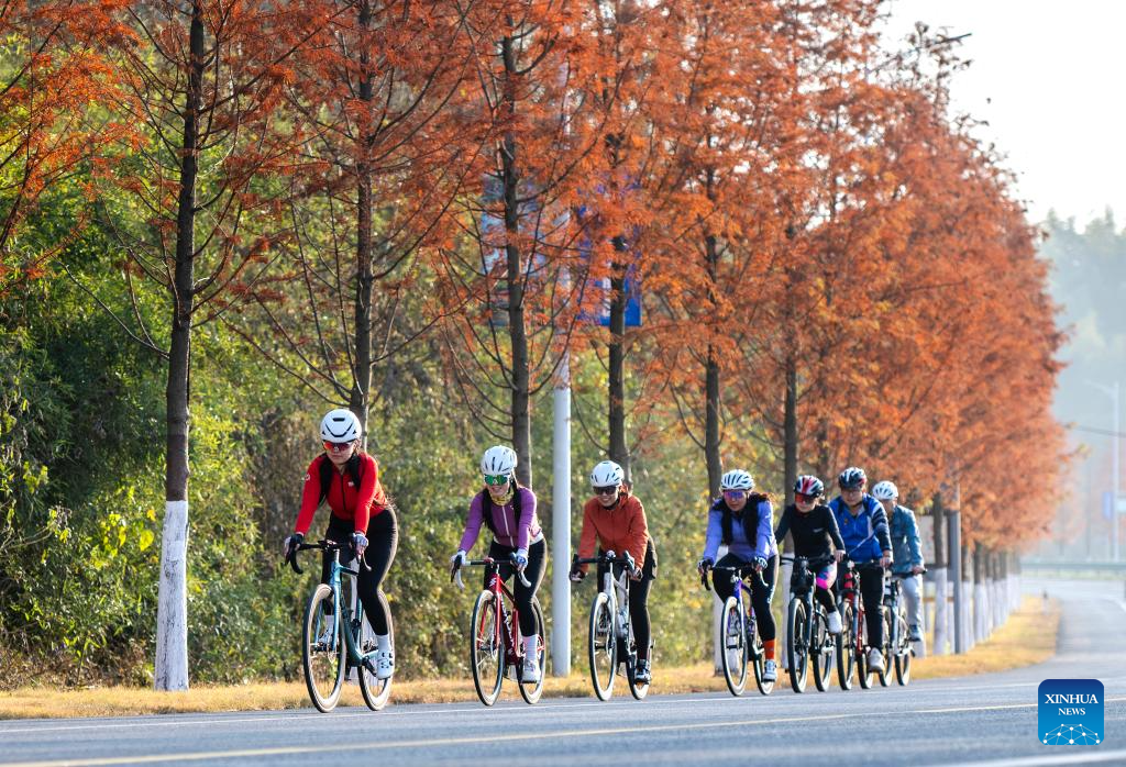 Cyclists ride on a road in Fanma Village, Wuhu City of east China's Anhui Province, Dec. 7, 2025. (Photo by Xiao Benxiang/Xinhua)