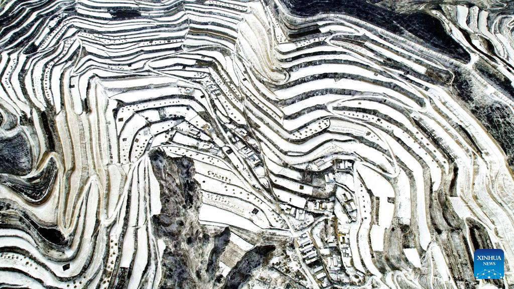 An aerial drone photo taken on Dec. 12, 2025 shows the scenery of terraced lands and village covered by snow in Honglin Village, Pingliang City of northwest China's Gansu Province. (Photo by Wang Yi/Xinhua)