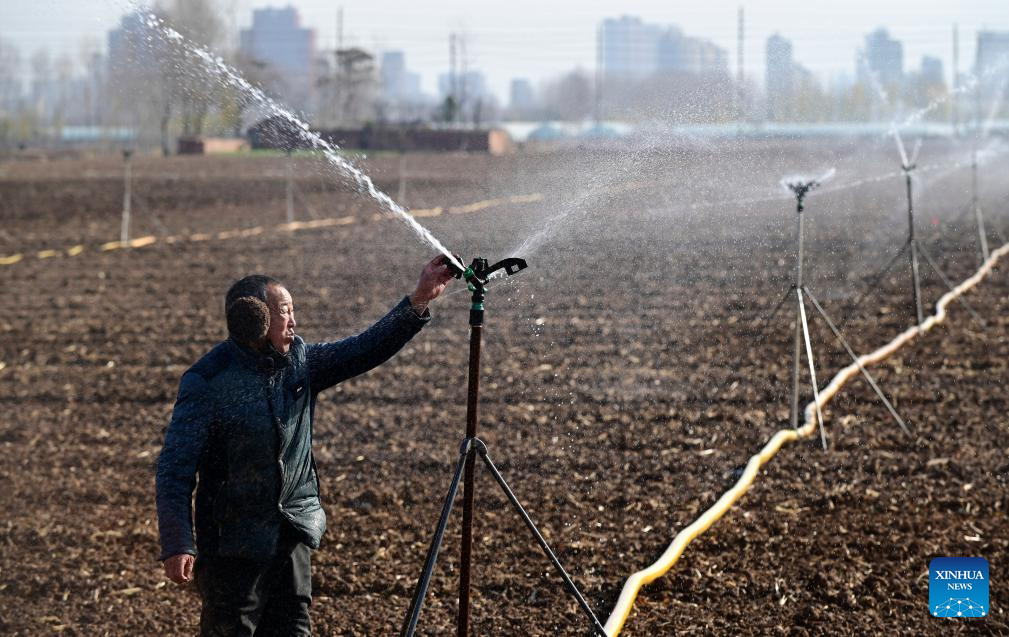 A farmer uses sprinkling irrigation devices to water just sowed winter wheat at a field in Xiaozuo Village, Qinyang City of central China's Henan Province, Dec. 2, 2025. (Photo by Yang Fan/Xinhua)