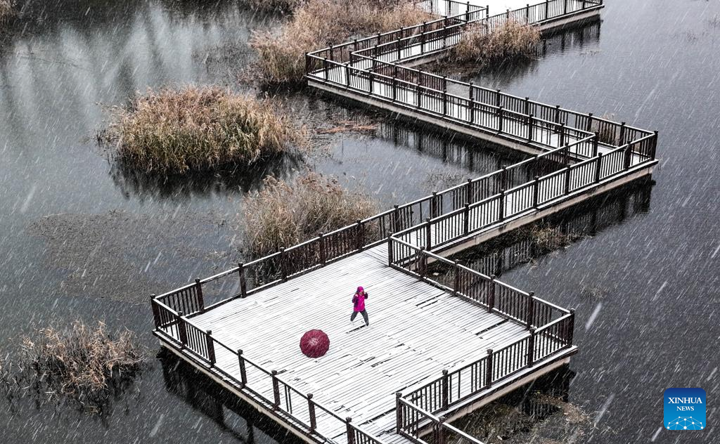 A drone photo taken on Dec. 12, 2025 shows a tourist enjoying the snowfall on the Quyang Lake in Jiyuan, central China's Henan Province. (Photo by Miao Qiunao/Xinhua)