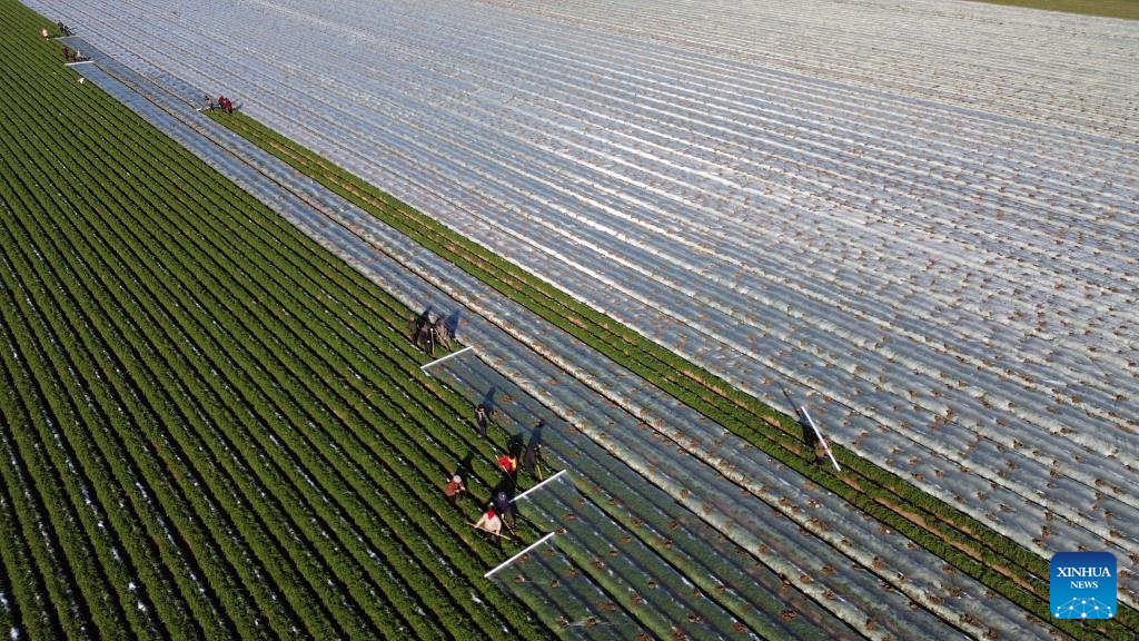 A drone photo taken on Dec. 14, 2025 shows farmers covering films for carrots at a vegetable base in Yaozhuang Village, Yanling County of central China's Henan Province. (Photo by Niu Shupei/Xinhua)