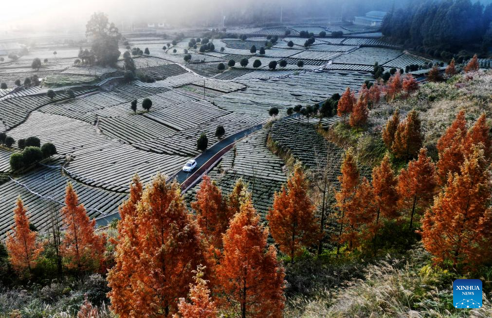 This photo taken on Nov. 25, 2025 shows a tea garden covered by frost in Dashaba Village, Xianfeng County, Enshi of central China's Hubei Province. (Photo by Li Weijun/Xinhua)