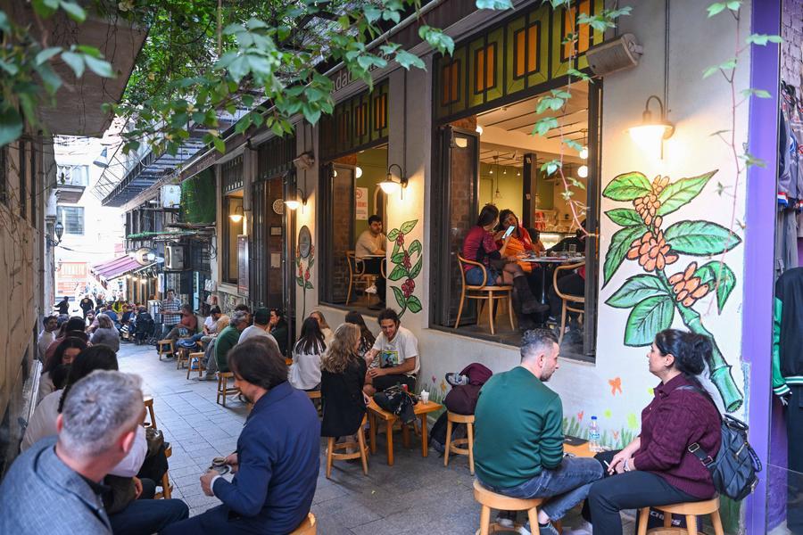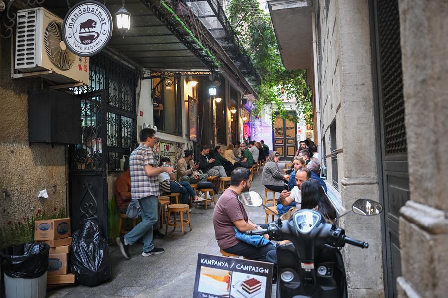 Customers enjoy coffee in the alley outside the Turkish cafe Mandabatmaz in Istanbul, Türkiye, Nov. 22, 2025. (Xinhua/Liu Lei)This photo taken on Nov. 22, 2025 shows the entrance of an alley where the Turkish cafe Mandabatmaz is located, at Istiklal Avenue in Istanbul, Türkiye. (Xinhua/Liu Lei)
