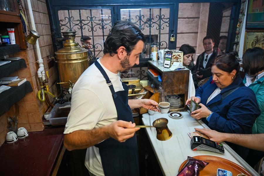 Can Ozmen, owner of the Turkish cafe Mandabatmaz, makes Turkish coffee at his cafe in Istanbul, Türkiye, Nov. 22, 2025. (Xinhua/Liu Lei)A staff member serves brewed coffee to customers at the Turkish cafe Mandabatmaz in Istanbul, Türkiye, Nov. 22, 2025. (Xinhua/Liu Lei)Customers take selfies outside the Turkish cafe Mandabatmaz in Istanbul, Türkiye, Nov. 22, 2025. (Xinhua/Liu Lei)This photo taken on Nov. 16, 2025 shows the coffee made by Li Jinhe at his cafe in Mangkuan Township of Baoshan City, southwest China's Yunnan Province. (Xinhua/Gao Yongwei)Customers pose for photos at a cafe run by Li Jinhe in Mangkuan Township of Baoshan City, southwest China's Yunnan Province, Nov. 15, 2025. (Xinhua/Wang Guansen)■