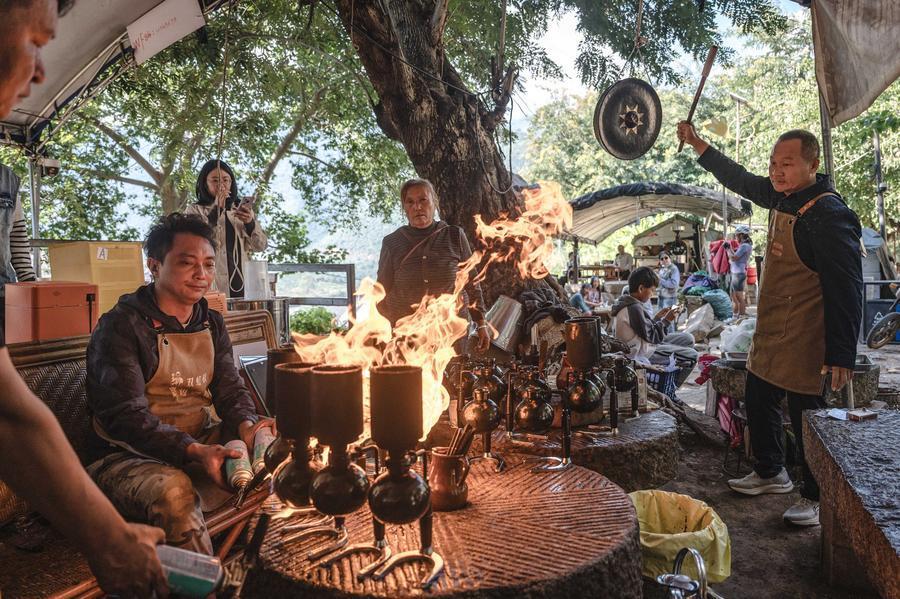 Guo Shuai (L), a cafe owner from Benxi in northeast China's Liaoning Province, learns under the instruction of Li Jinhe at the cafe in Mangkuan Township of Baoshan City, southwest China's Yunnan Province, Nov. 15, 2025. (Xinhua/Wang Guansen)Customers shoot the process of making coffee at a cafe run by Li Jinhe in Mangkuan Township of Baoshan City, southwest China's Yunnan Province, Nov. 15, 2025. (Xinhua/Wang Guansen)People watch Li Jinhe (R) making coffee at his cafe in Mangkuan Township of Baoshan City, southwest China's Yunnan Province, Nov. 15, 2025. (Xinhua/Gao Yongwei)