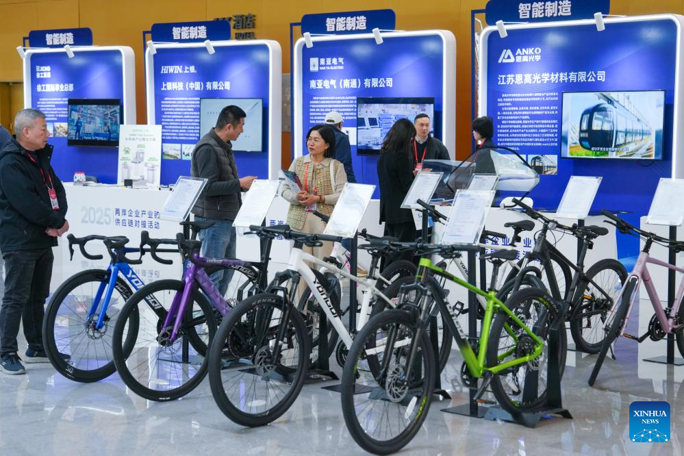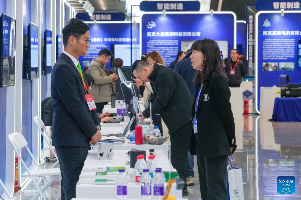 Participants visit an exhibition area of the 2025 annual conference of the Cross-Strait CEO Summit in Nanjing, east China's Jiangsu Province, Dec. 16, 2025. The 2025 annual conference of the Cross-Strait CEO Summit opened here Tuesday. About 800 people from the Chinese mainland and Taiwan gathered on Tuesday in Nanjing to discuss cross-Strait industrial transformation, innovation and cooperation. (Xinhua/Li Bo)