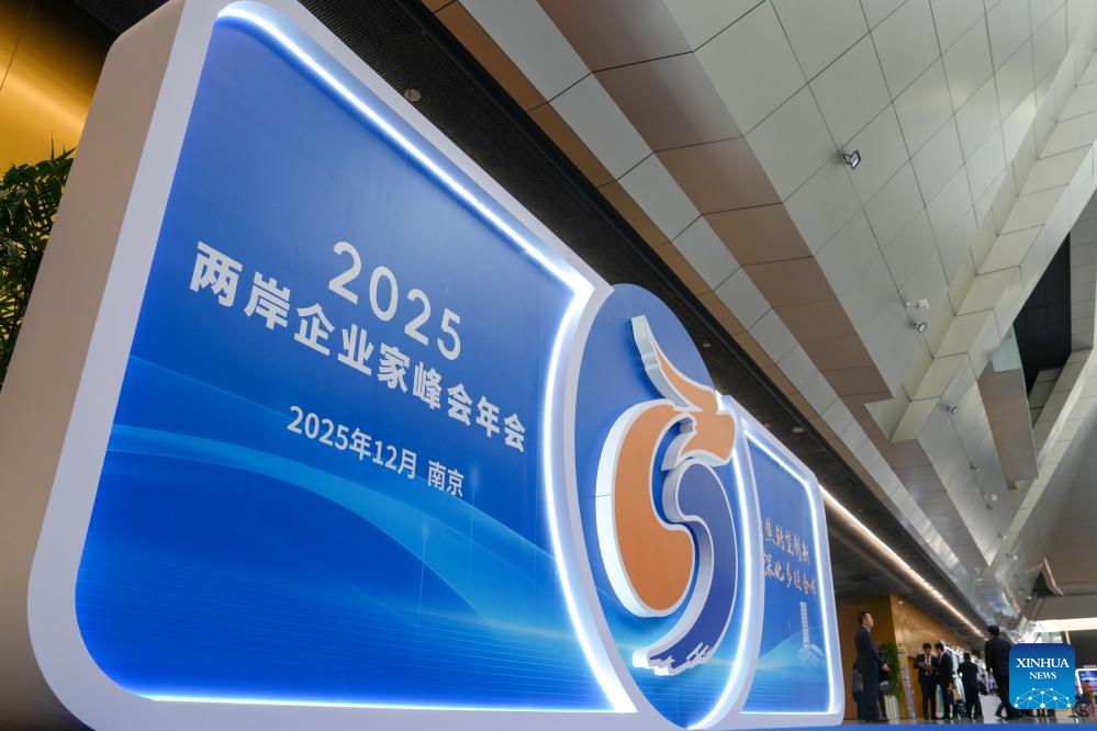 This photo shows a display board at the entrance of the main venue of the 2025 annual conference of the Cross-Strait CEO Summit in Nanjing, east China's Jiangsu Province, Dec. 16, 2025. The 2025 annual conference of the Cross-Strait CEO Summit opened here Tuesday. About 800 people from the Chinese mainland and Taiwan gathered on Tuesday in Nanjing to discuss cross-Strait industrial transformation, innovation and cooperation. (Xinhua/Li Bo)
