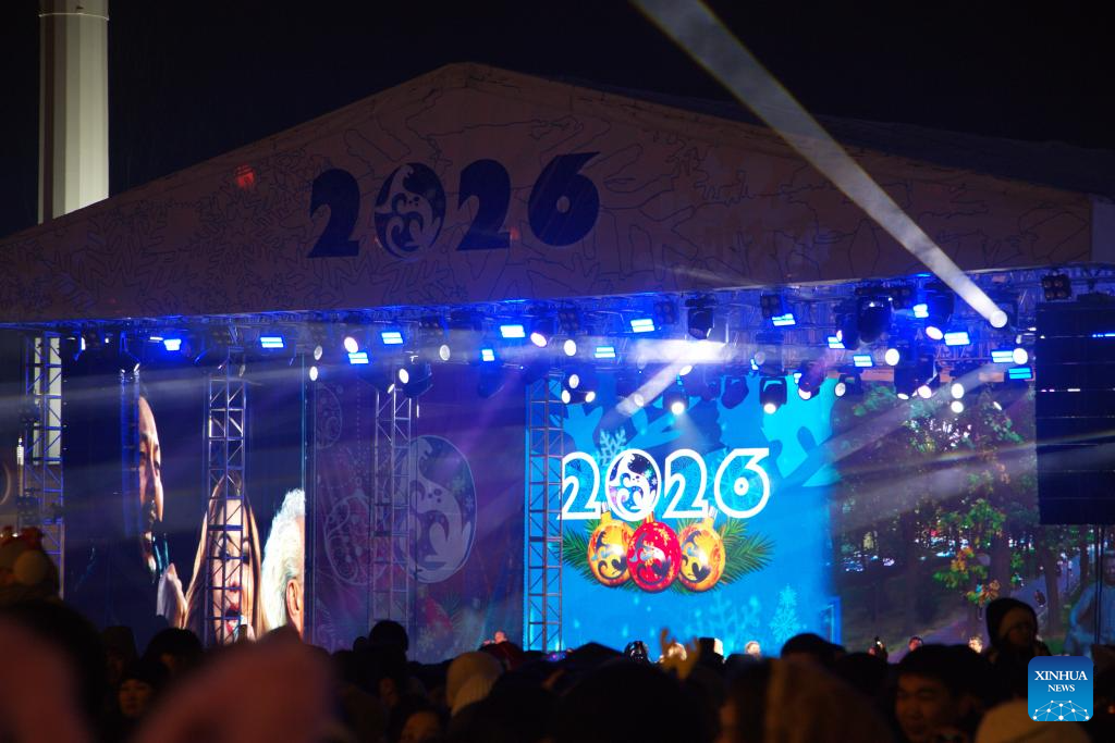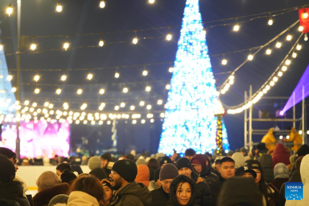 People attend the New Year tree lighting ceremony in Bishkek, Kyrgyzstan, Dec. 15, 2025. (Xinhua/Jiang Youlin)
