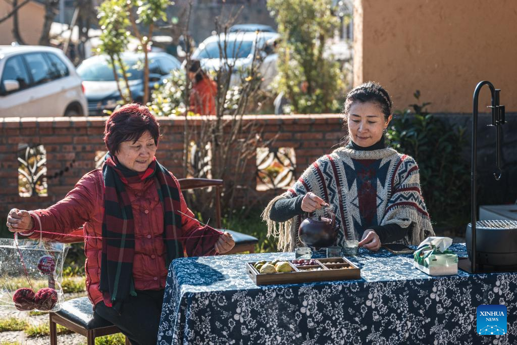 People enjoy leisure time in the Huangba neighborhood of Qujing City, southwest China's Yunnan Province, Dec. 16, 2025. The Huangba neighborhood is one of the local model travel destinations promoted by Qujing City, which has in recent years made great efforts to help transform the local ecological advantages into tourism resources. A number of livable and business-friendly villages are built here for rural revitalization. (Xinhua/Wang Guansen)