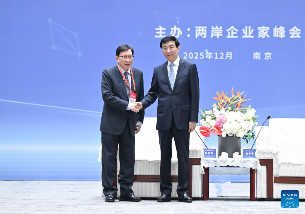 Wang Huning, a member of the Standing Committee of the Political Bureau of the Communist Party of China Central Committee and chairman of the National Committee of the Chinese People's Political Consultative Conference, meets with Liu Chao-shiuan, co-president of the Cross-Strait CEO Summit from Taiwan, and cross-strait entrepreneur representatives, before the opening ceremony of the 2025 annual conference of the Cross-Strait CEO Summit in Nanjing, east China's Jiangsu Province, Dec. 16, 2025. (Xinhua/Li Xiang)