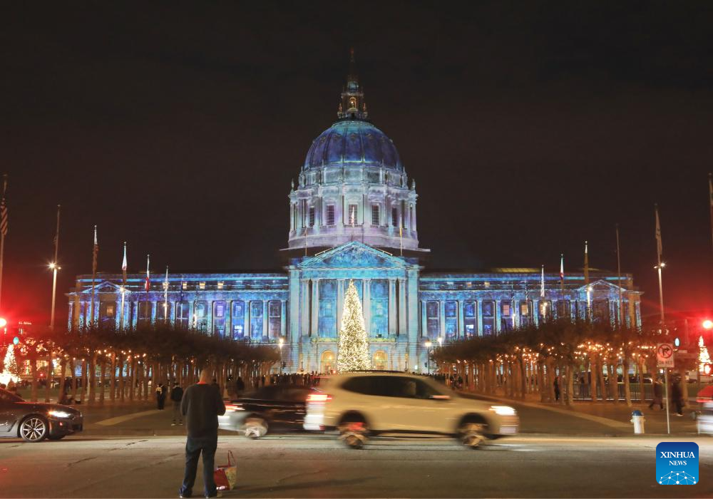 The "City Hall Winter Lights" show is staged outside the City Hall in San Francisco, the United States, Dec. 16, 2025. (Photo by Liu Yilin/Xinhua)