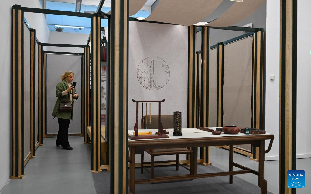 A visitor takes photos of an exhibit during an exhibition titled "Anshan Cuijin - an Exhibition of Chinese Life Aesthetics" at the China Cultural Center in Madrid, Spain, Dec. 16, 2025. The exhibition kicked off here on Tuesday and will run until March 2026, presenting the elegant charm of Chinese aesthetics. (Xinhua/Cheng Min)
