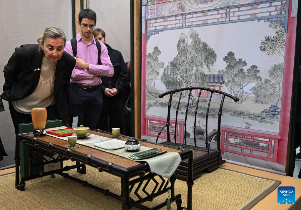 Visitors view exhibits during an exhibition titled "Anshan Cuijin - an Exhibition of Chinese Life Aesthetics" at the China Cultural Center in Madrid, Spain, Dec. 16, 2025. The exhibition kicked off here on Tuesday and will run until March 2026, presenting the elegant charm of Chinese aesthetics. (Xinhua/Cheng Min)