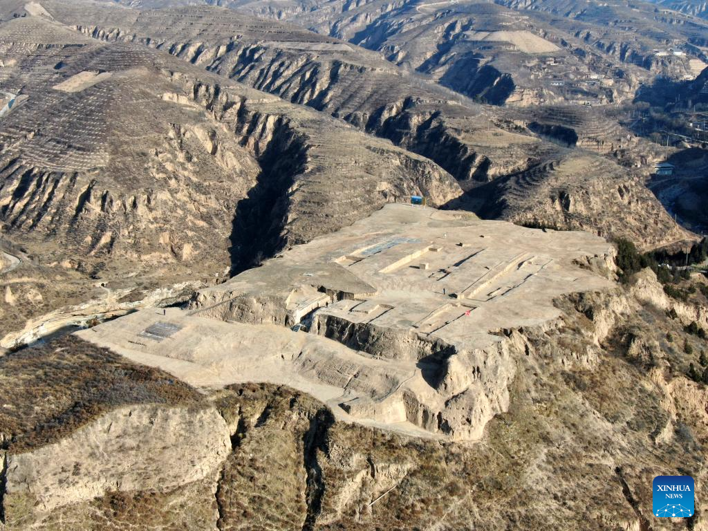 An aerial drone photo taken on Dec. 9, 2025 shows part of the Zhaigou site in Qingjian County, northwest China's Shaanxi Province. The Zhaigou site, a settlement site dating back to about 3,200 years ago, was listed as one of the major field archaeological discoveries during the sixth Shanghai Archaeology Forum (SAF2025) in east China's Shanghai on Tuesday. (Xinhua/Li Yibo)