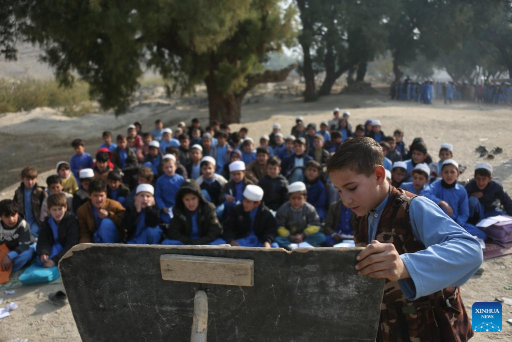 Students attend an outdoor class at a makeshift roadside school without proper shelters beside a highway junction in Nangarhar province, eastern Afghanistan, Dec. 16, 2025. (Photo by Saifurahman Safi/Xinhua)