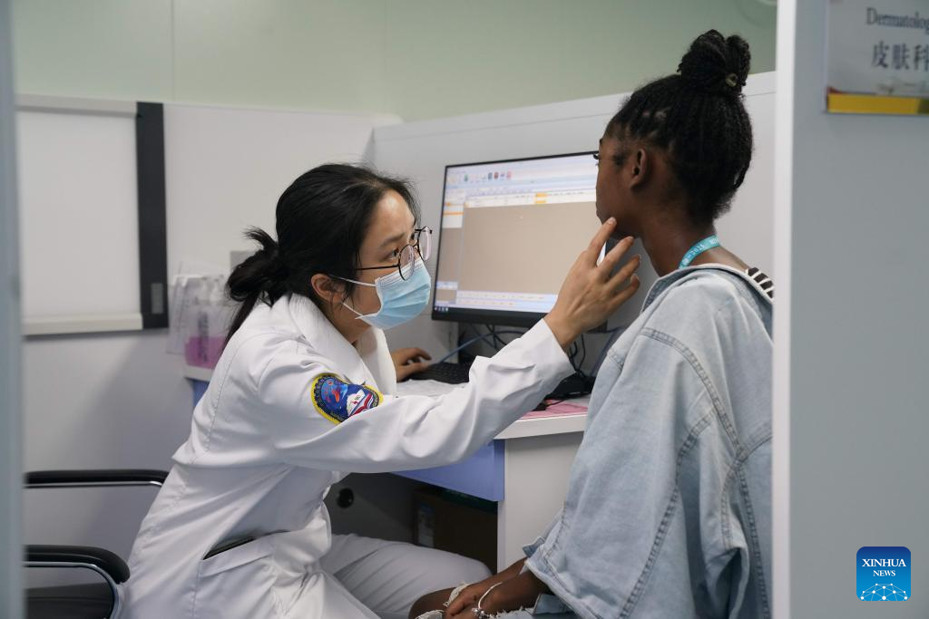 A dermatologist from the Chinese Navy hospital ship "Silk Road Ark" provides medical treatment for a patient in Montego Bay, Jamaica, Dec. 7, 2025. (Photo by He Yuqian/Xinhua)