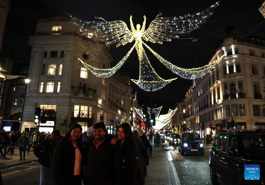 People pose for photos on Regent Street decorated with lights in London, Britain, on Dec. 17, 2025. (Xinhua/Li Ying)