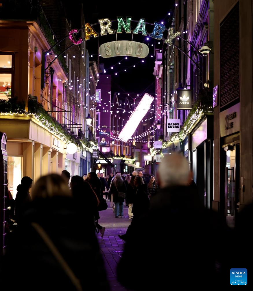 People walk on Carnaby Street decorated with lights in London, Britain, on Dec. 17, 2025. (Xinhua/Li Ying)