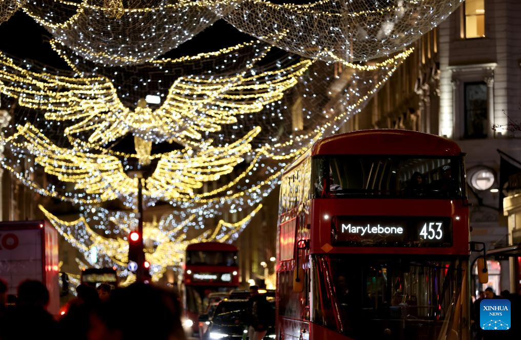 A double-decker bus runs on Regent Street decorated with lights in London, Britain, on Dec. 17, 2025. (Xinhua/Li Ying)