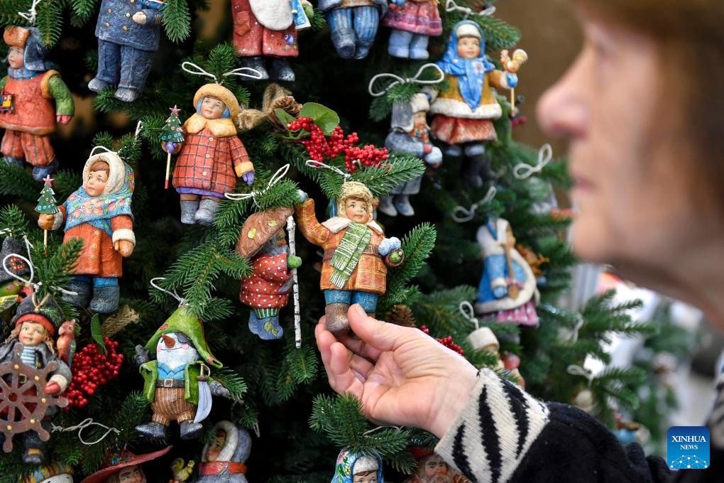 A visitor looks at handmade toys on display at the "Ladya" exhibition and fair of Russian folk arts and crafts in Moscow, Russia, Dec. 17, 2025. The exhibition is held from December 17-21 this year. (Photo by Alexander Zemlianichenko Jr/Xinhua)