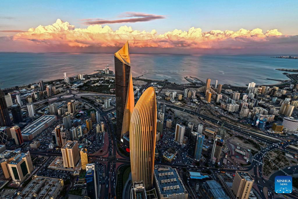 A drone photo taken on Dec. 17, 2025 shows a city view with clouds rolling over Kuwait City, Kuwait. (Photo by Asad/Xinhua)