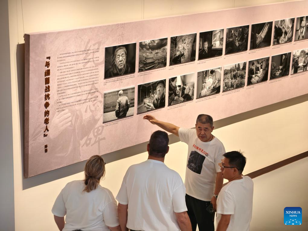 Han Qiang (2nd R) introduces his photographic works to William Ross Kantenberger (2nd L), grandson of a U.S. airman from the 1942 Doolittle Raid, and his wife Tracy Kantenberger (1st L) at the Yuandao Museum in Quzhou, east China's Zhejiang Province, Sept. 10, 2025.(Xinhua/Liu Ziyi)