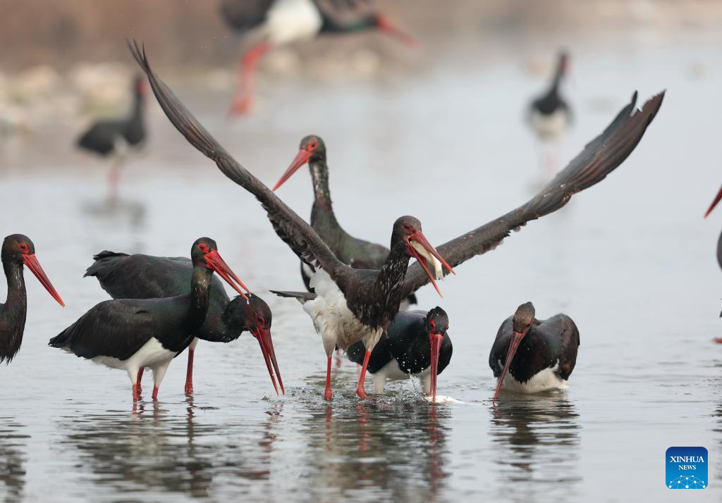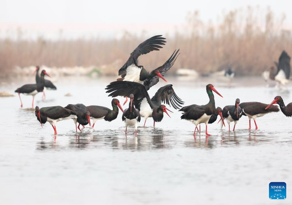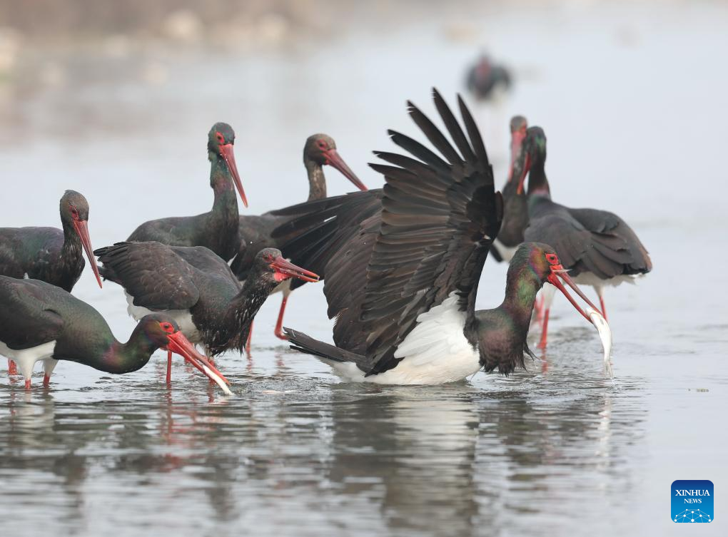 Black storks forage at Mianman River in Jingxing County, north China's Hebei Province, Dec. 19, 2025. Black stork is a migratory bird species under first-class national protection in China. (Xinhua/Yang Shiyao)