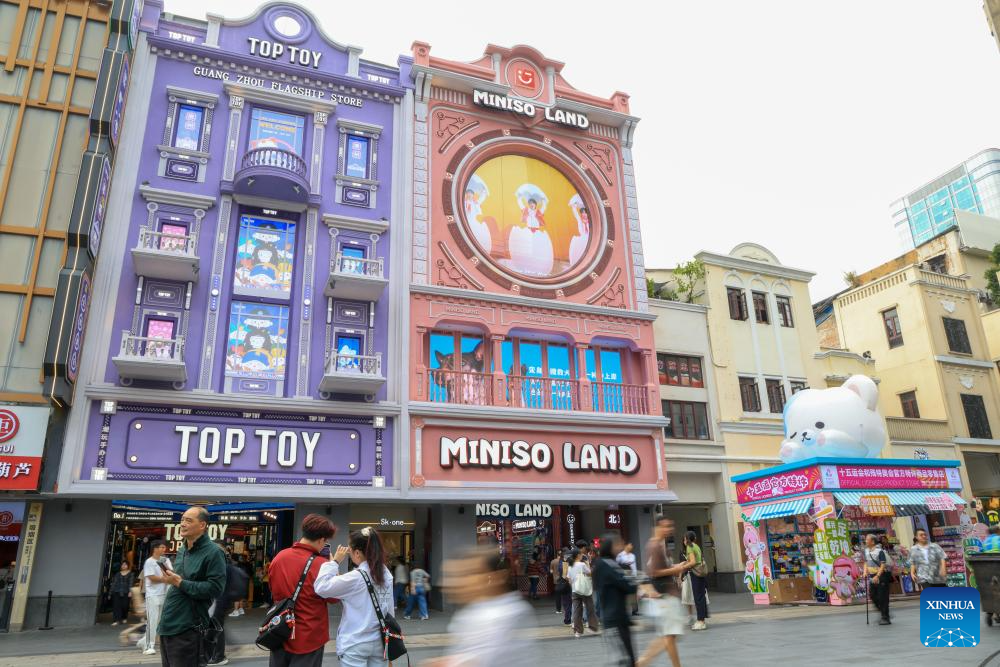 This photo shows a MINISO LAND store and a TOP TOY store on Beijing Road, a bustling pedestrian street in Guangzhou, south China's Guangdong Province, Oct. 28, 2025.