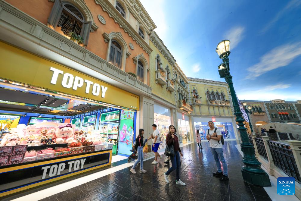 Tourists walk past a TOP TOY store in Macao, south China, Dec. 11, 2025.