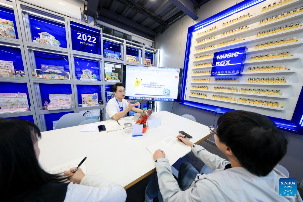 Designers talk about Sanrio-themed blind boxes at Guangzhou Moetch Cultural & Creative Co., Ltd. in Guangzhou, south China's Guangdong Province, Oct. 28, 2025.