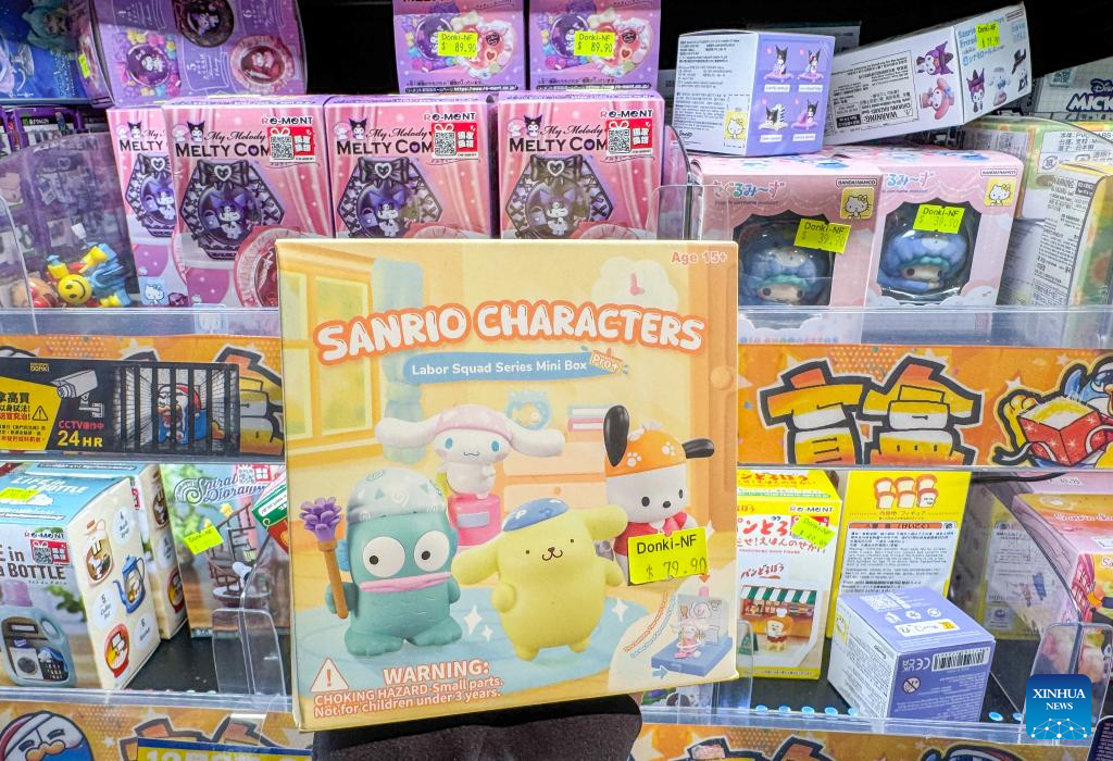 This photo shows Sanrio-themed blind boxes made by Guangzhou Moetch Cultural & Creative Co., Ltd. at a Don Don Donki store in Macao, south China, Dec. 14, 2025.