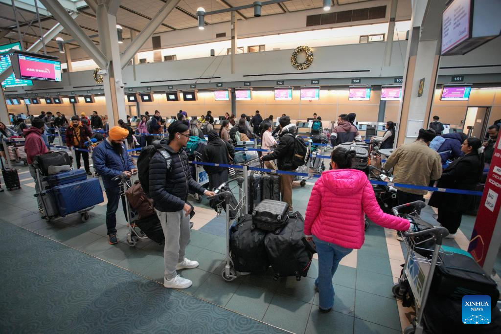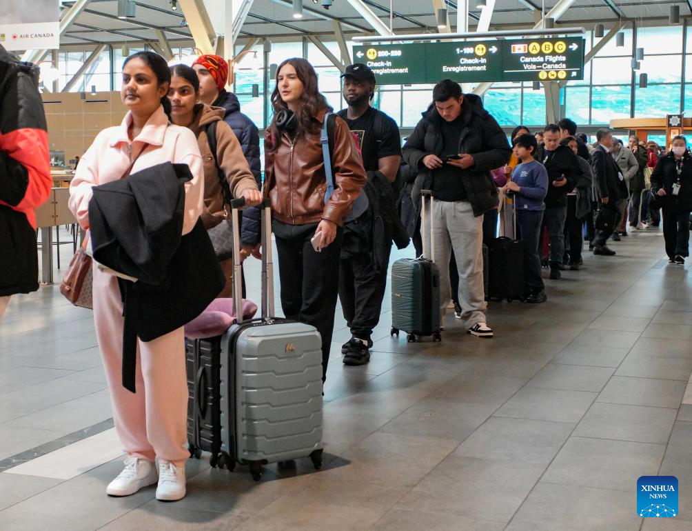 Passengers line up to check in at Vancouver International Airport in Richmond, British Columbia, Canada, Dec. 18, 2025. Winter holiday travel season has come, Vancouver International Airport handled more than 76,800 passenger trips on Thursday. (Photo by Liang Sen/Xinhua)