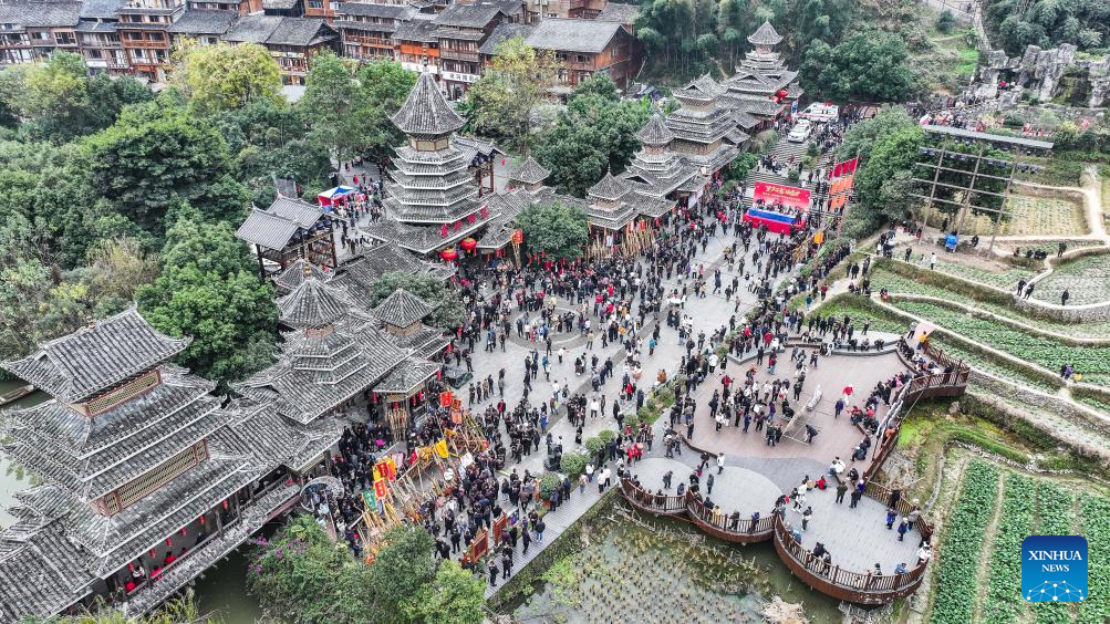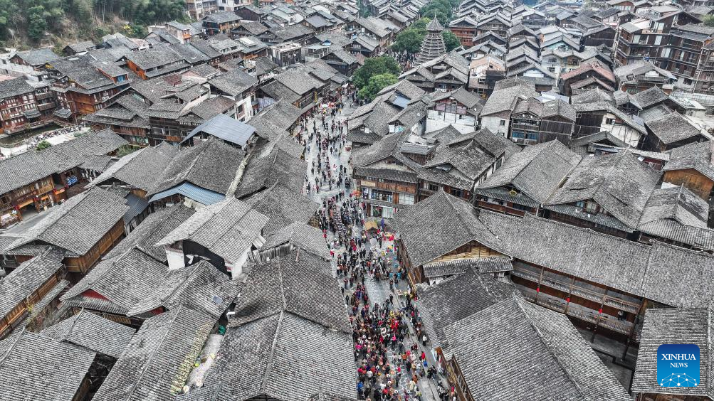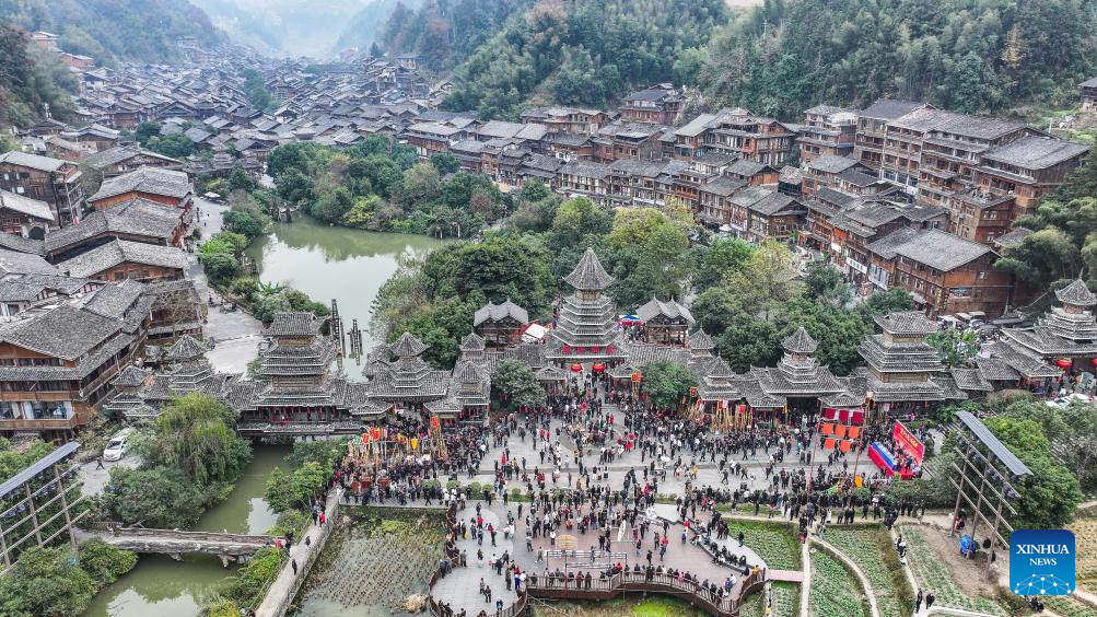 An aerial drone photo taken on Dec. 20, 2025 shows tourists and people of Dong ethnic group celebrating the Dong New Year at Zhaoxing Dong village of Liping County, Qiandongnan Miao and Dong Autonomous Prefecture, southwest China's Guizhou Province. Dong New Year, a traditional festival for harvest and gathering, was enlisted as one of China's national intangible cultural heritages in 2011. Various activities were held in Liping County over the weekend. (Xinhua/Tao Liang)