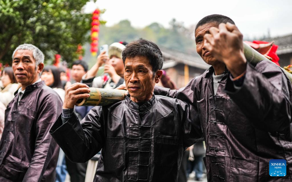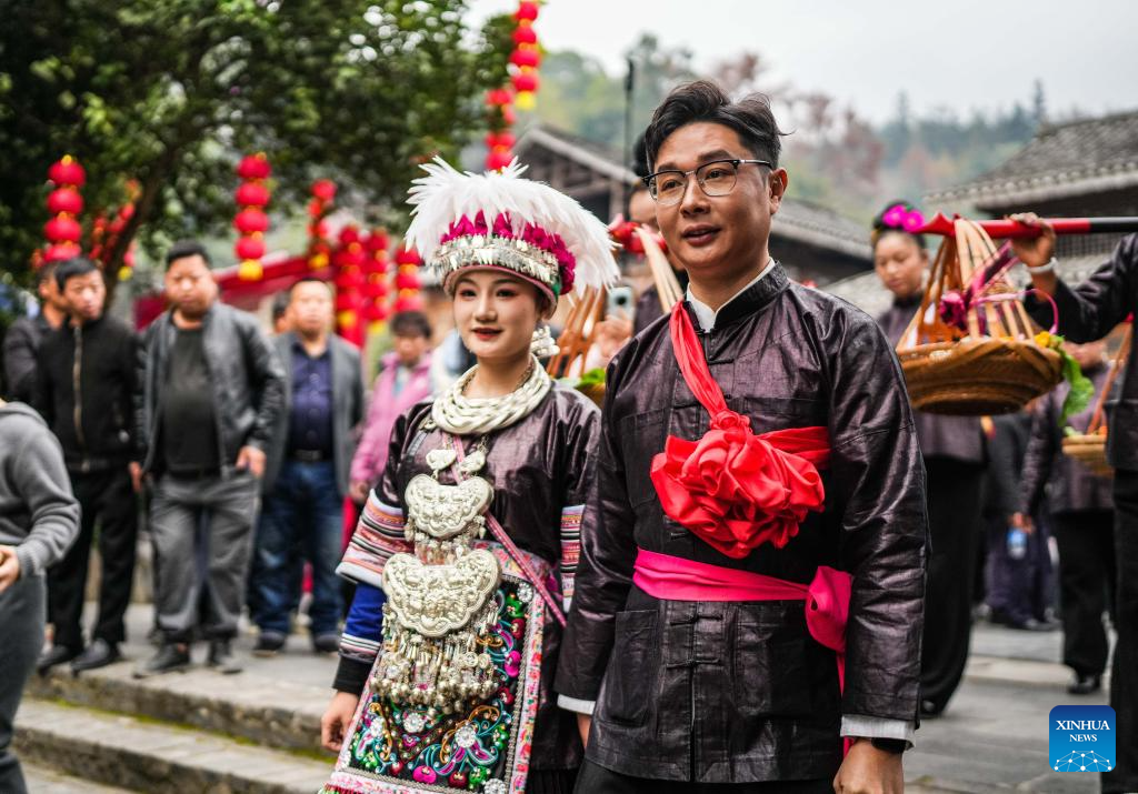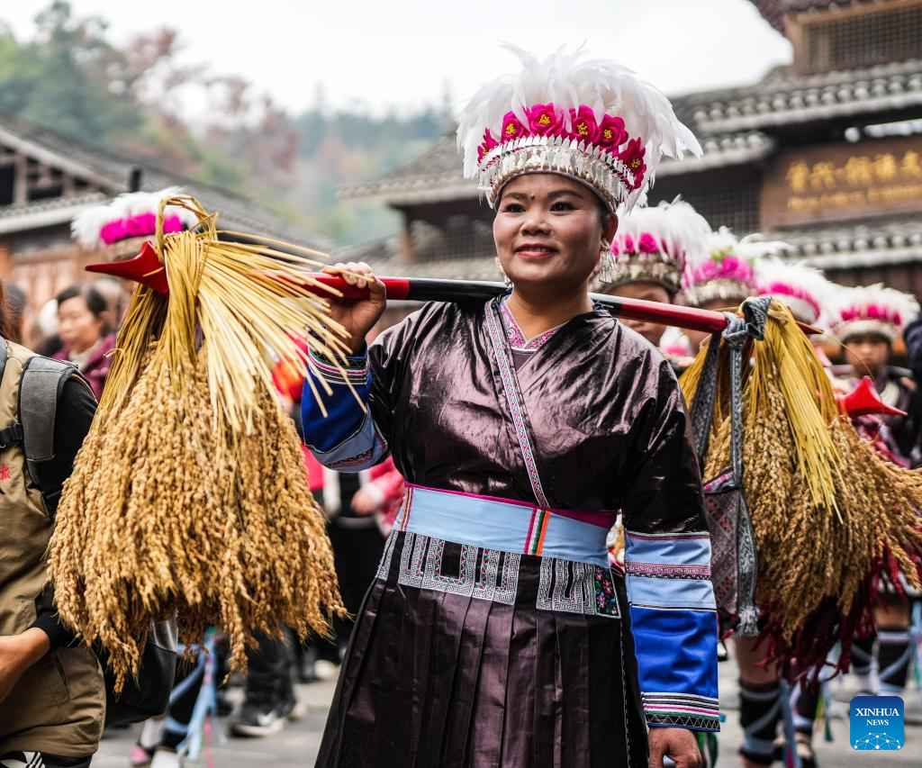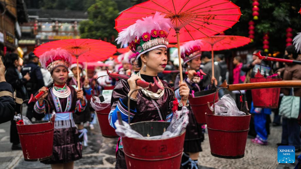 A performance team parades during an event in celebration of Dong New Year at Zhaoxing Dong village of Liping County, Qiandongnan Miao and Dong Autonomous Prefecture, southwest China's Guizhou Province, Dec. 20, 2025. Dong New Year, a traditional festival for harvest and gathering, was enlisted as one of China's national intangible cultural heritages in 2011. Various activities were held in Liping County over the weekend. (Xinhua/Tao Liang)