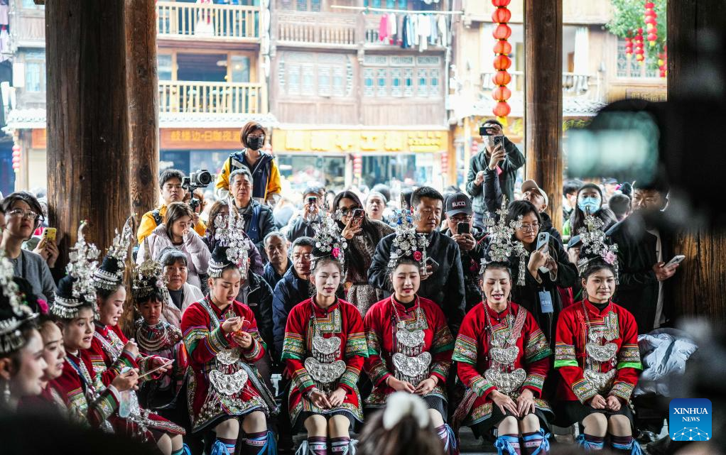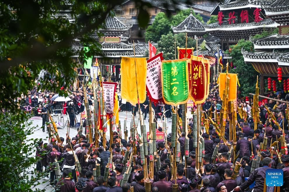 People of Dong ethnic group play Lusheng, a traditional reed-pipe wind instrument, during an event in celebration of the Dong New Year at Zhaoxing Dong village of Liping County, Qiandongnan Miao and Dong Autonomous Prefecture, southwest China's Guizhou Province, Dec. 20, 2025. Dong New Year, a traditional festival for harvest and gathering, was enlisted as one of China's national intangible cultural heritages in 2011. Various activities were held in Liping County over the weekend. (Xinhua/Yang Wenbin)