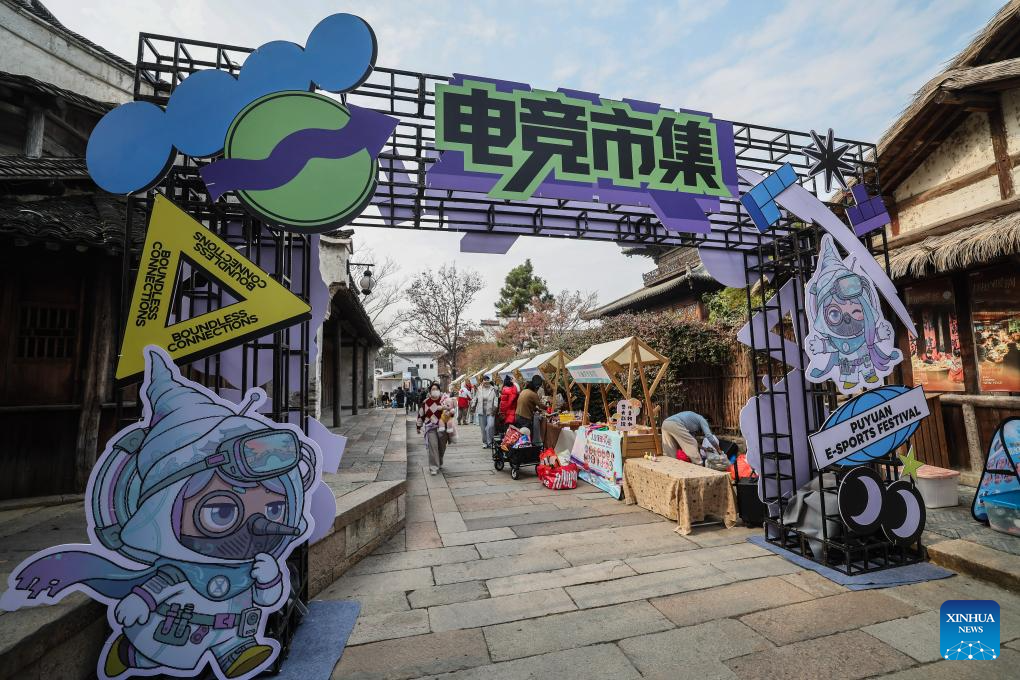 This photo taken on Dec. 20, 2025 shows a fair during the Puyuan E-sports Festival 2025 in Tongxiang, east China's Zhejiang Province. The festival kicked off here on Saturday and will last until Dec. 28. (Xinhua/Xu Yu)