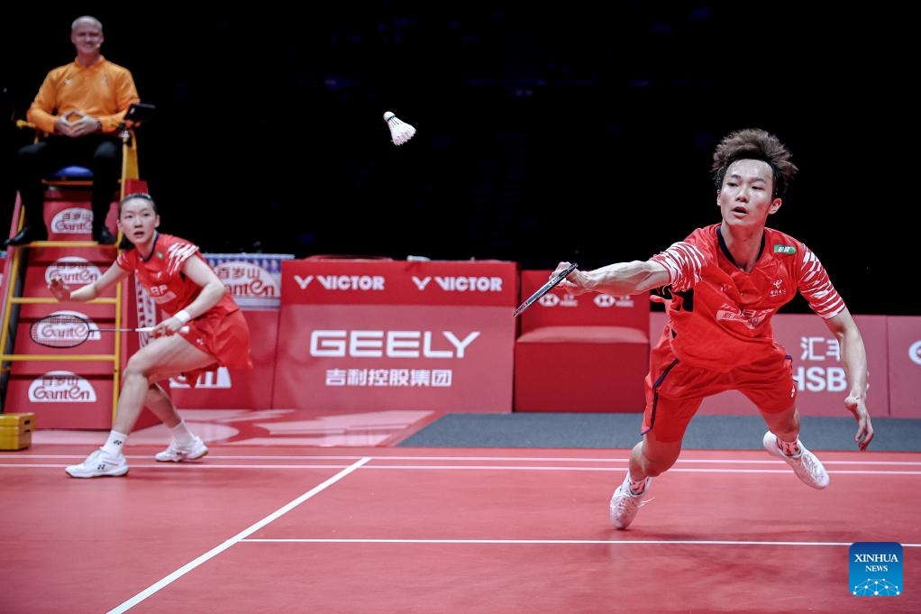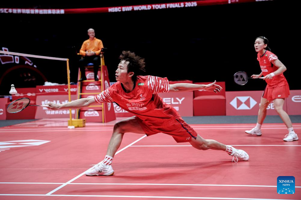Jiang Zhenbang/Wei Yaxin (L) of China compete during the mixed doubles semifinal match between Jiang Zhenbang/Wei Yaxin of China and Chen Tang Jie/Toh Ee Wei of Malaysia at BWF World Tour Finals 2025 in Hangzhou, east China's Zhejiang Province, Dec. 20, 2025. (Xinhua/Jiang Han)