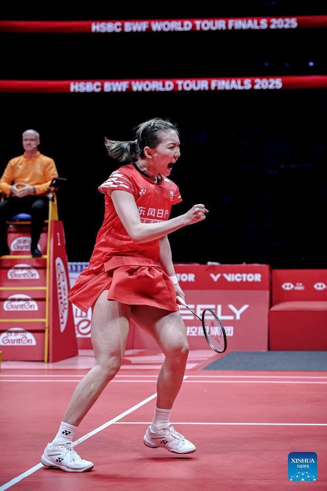 Wei Yaxin of China celebrates during the mixed doubles semifinal match between Jiang Zhenbang/Wei Yaxin of China and Chen Tang Jie/Toh Ee Wei of Malaysia at BWF World Tour Finals 2025 in Hangzhou, east China's Zhejiang Province, Dec. 20, 2025. (Xinhua/Jiang Han)