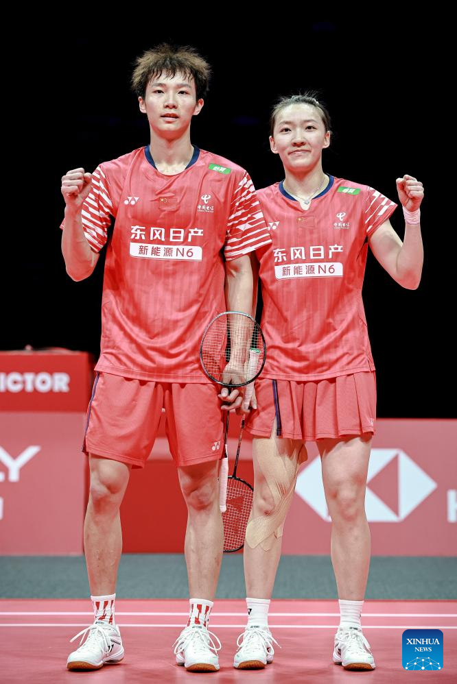 Jiang Zhenbang (L)/Wei Yaxin of China pose after the mixed doubles semifinal match between Jiang Zhenbang/Wei Yaxin of China and Chen Tang Jie/Toh Ee Wei of Malaysia at BWF World Tour Finals 2025 in Hangzhou, east China's Zhejiang Province, Dec. 20, 2025. (Xinhua/Jiang Han)