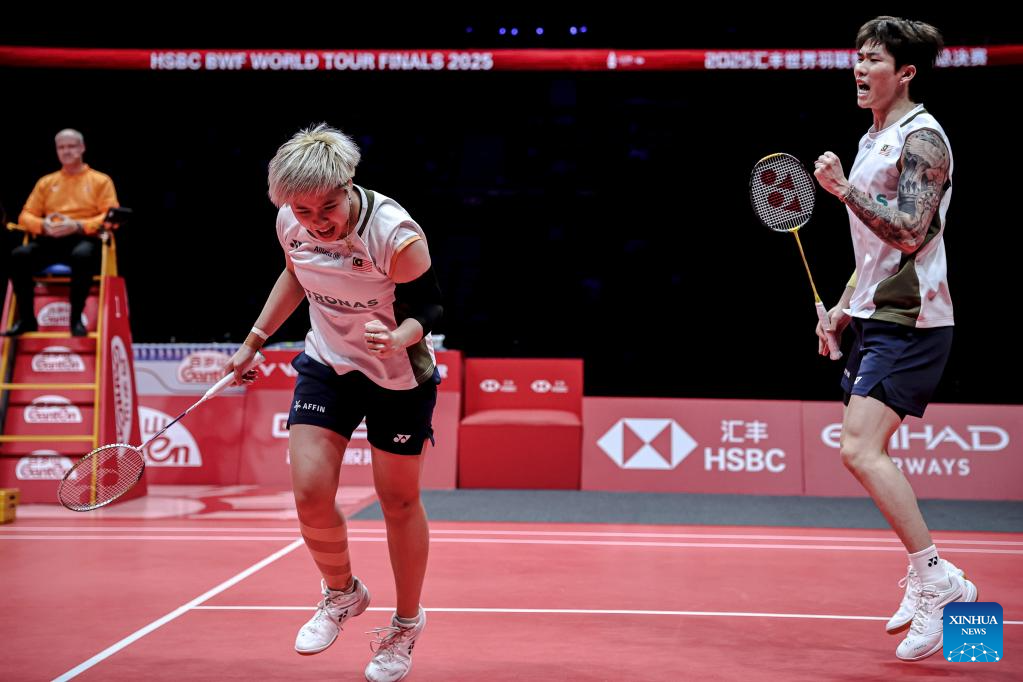 Chen Tang Jie/Toh Ee Wei (L) of Malaysia celebrate during the mixed doubles semifinal match between Jiang Zhenbang/Wei Yaxin of China and Chen Tang Jie/Toh Ee Wei of Malaysia at BWF World Tour Finals 2025 in Hangzhou, east China's Zhejiang Province, Dec. 20, 2025. (Xinhua/Jiang Han)