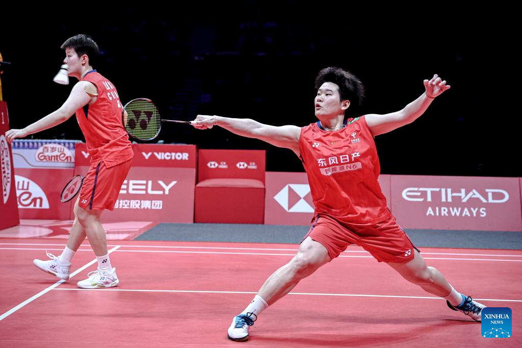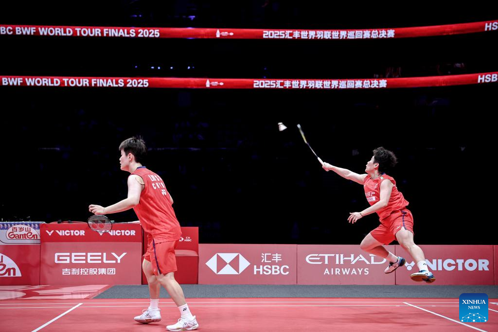 Jiang Zhenbang (L)/Wei Yaxin of China compete during the mixed doubles semifinal match between Jiang Zhenbang/Wei Yaxin of China and Chen Tang Jie/Toh Ee Wei of Malaysia at BWF World Tour Finals 2025 in Hangzhou, east China's Zhejiang Province, Dec. 20, 2025. (Xinhua/Jiang Han)