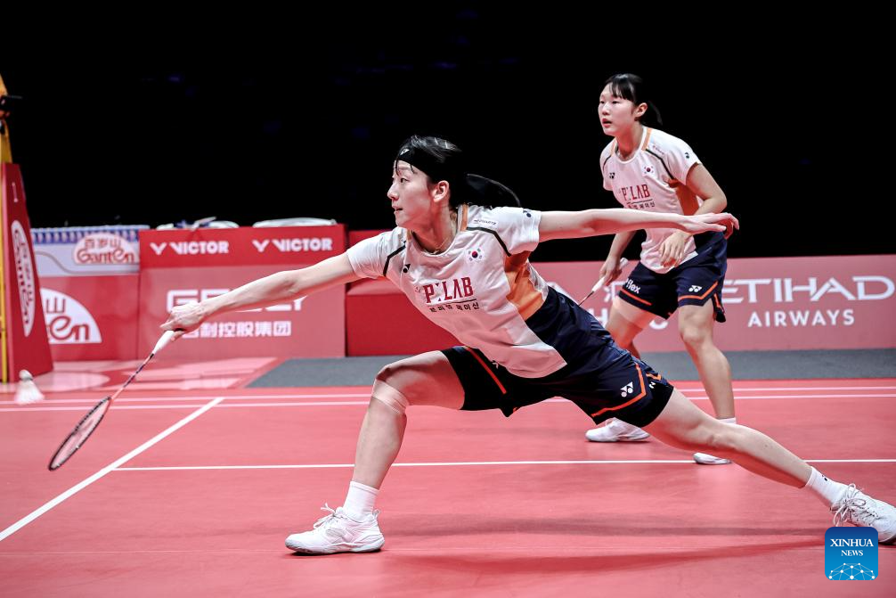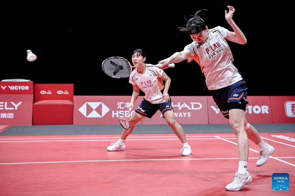 Baek Ha Na/Lee So Hee (L) of South Korea compete during the women's doubles semifinal match between Liu Shengshu/Tan Ning of China and Baek Ha Na/Lee So Hee of South Korea at BWF World Tour Finals 2025 in Hangzhou, east China's Zhejiang Province, Dec. 20, 2025. (Xinhua/Jiang Han)