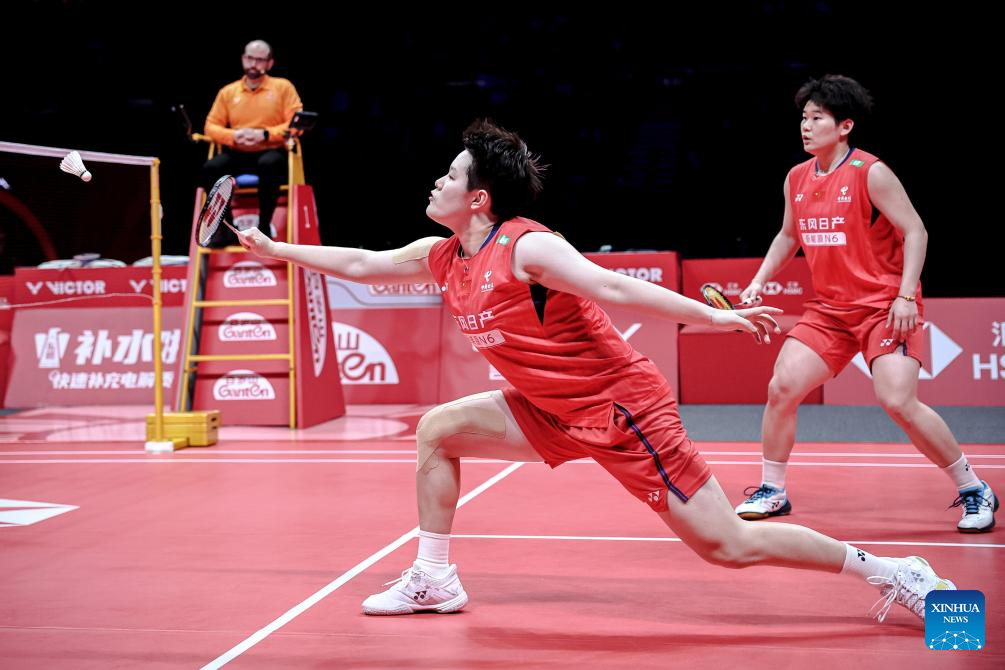 Liu Shengshu/Tan Ning (R) of China compete during the women's doubles semifinal match between Liu Shengshu/Tan Ning of China and Baek Ha Na/Lee So Hee of South Korea at BWF World Tour Finals 2025 in Hangzhou, east China's Zhejiang Province, Dec. 20, 2025. (Xinhua/Jiang Han)